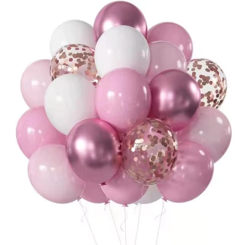 Set Deco de 50 Globos + 1 Cinta de color + 1 cinta de Pegamento Combinacion Colores Rosas/Confeti/Blanco