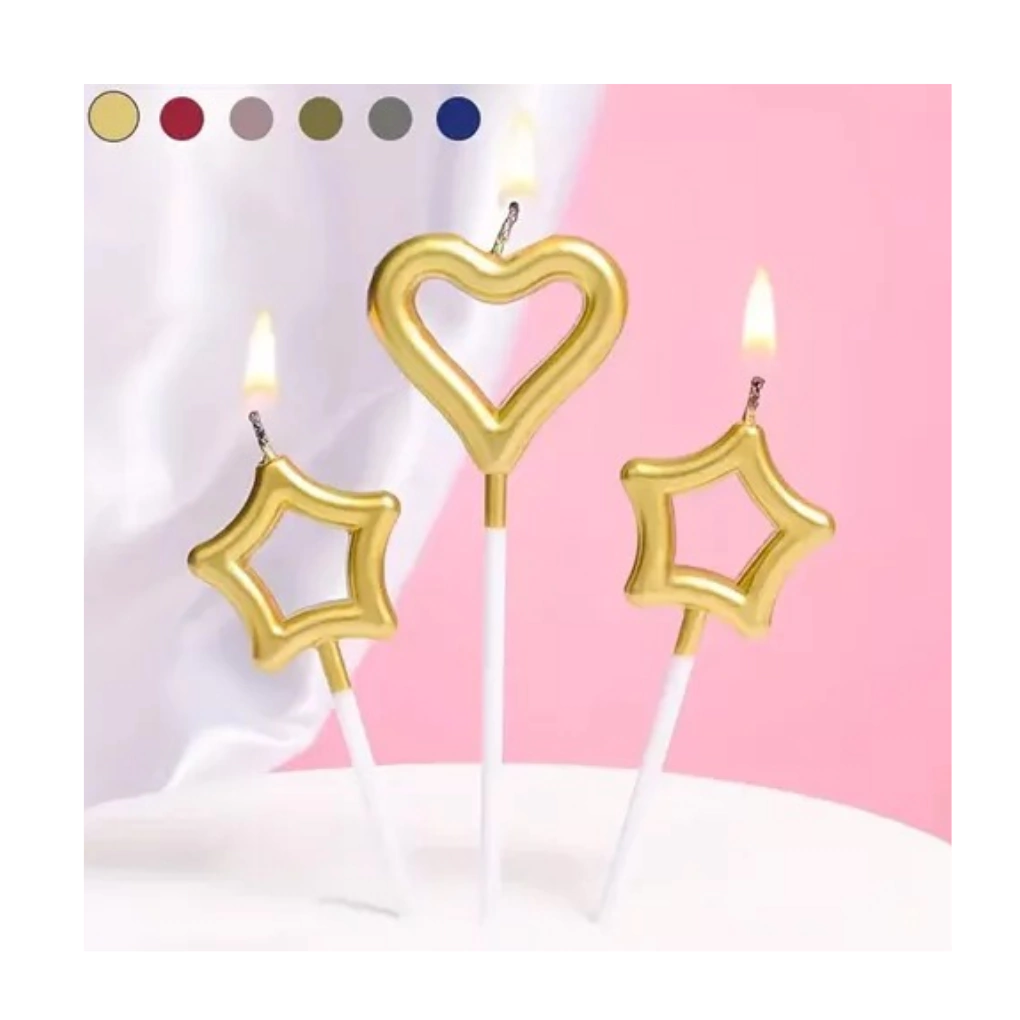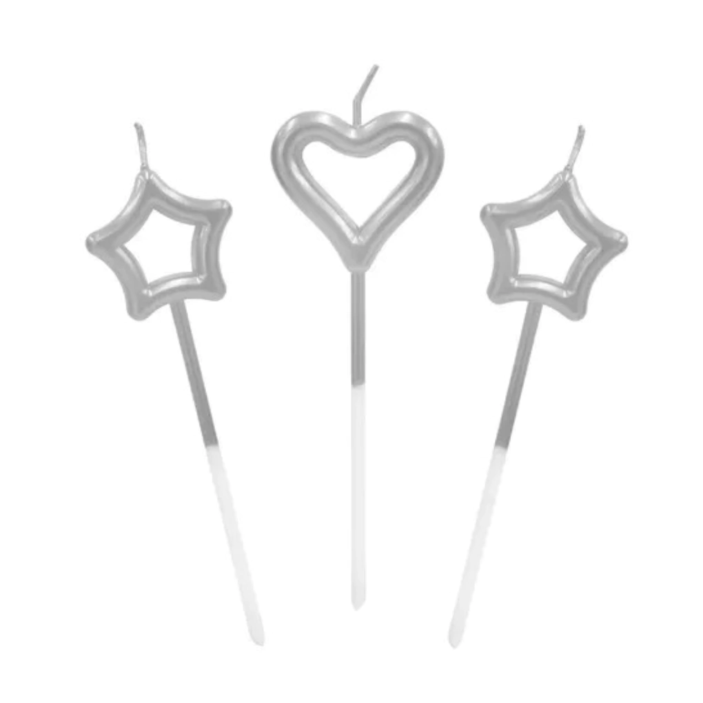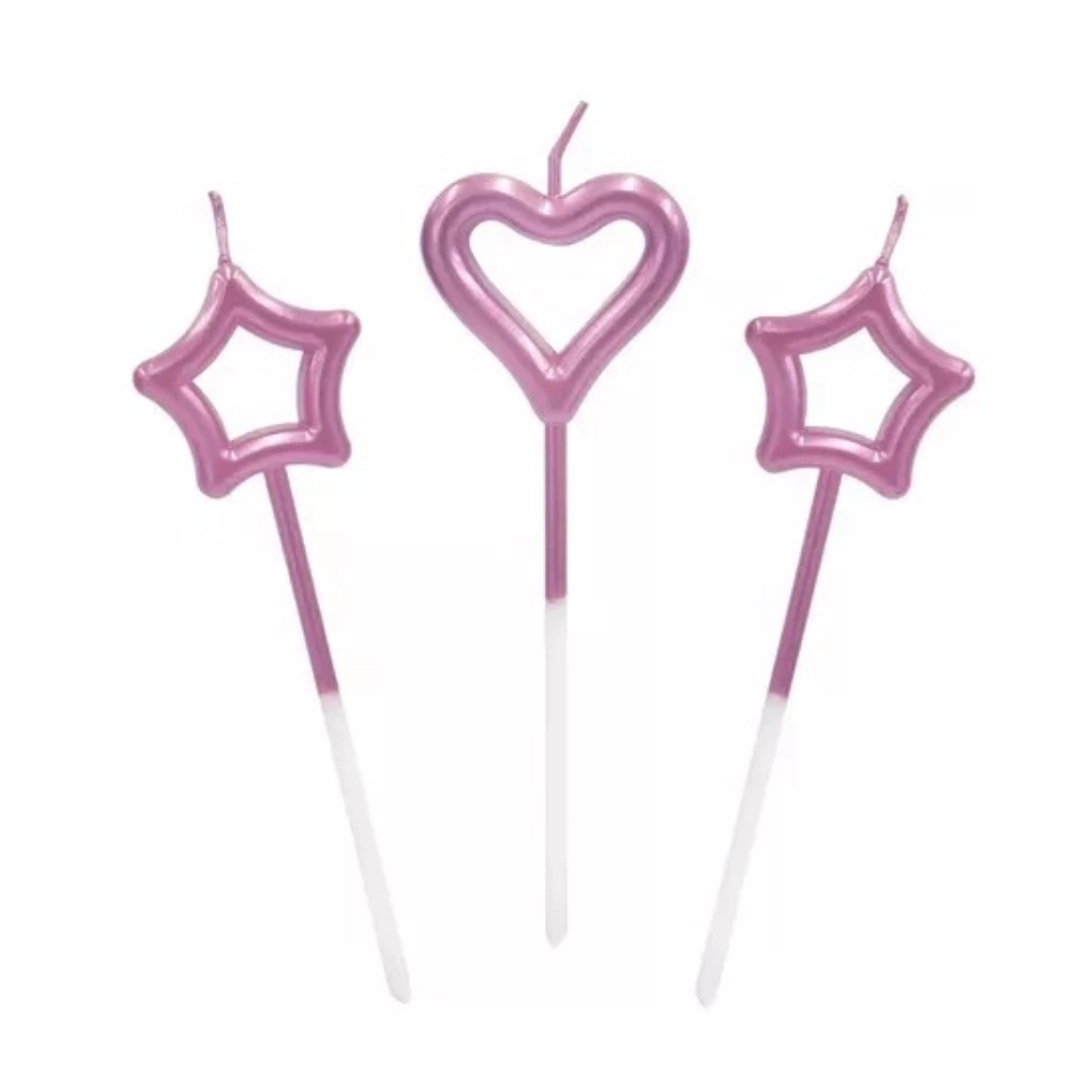 Velas Metalizadas Corazón y Estrella 15 cm Rosa, Plateada y Dorada Pack x 3 unidades